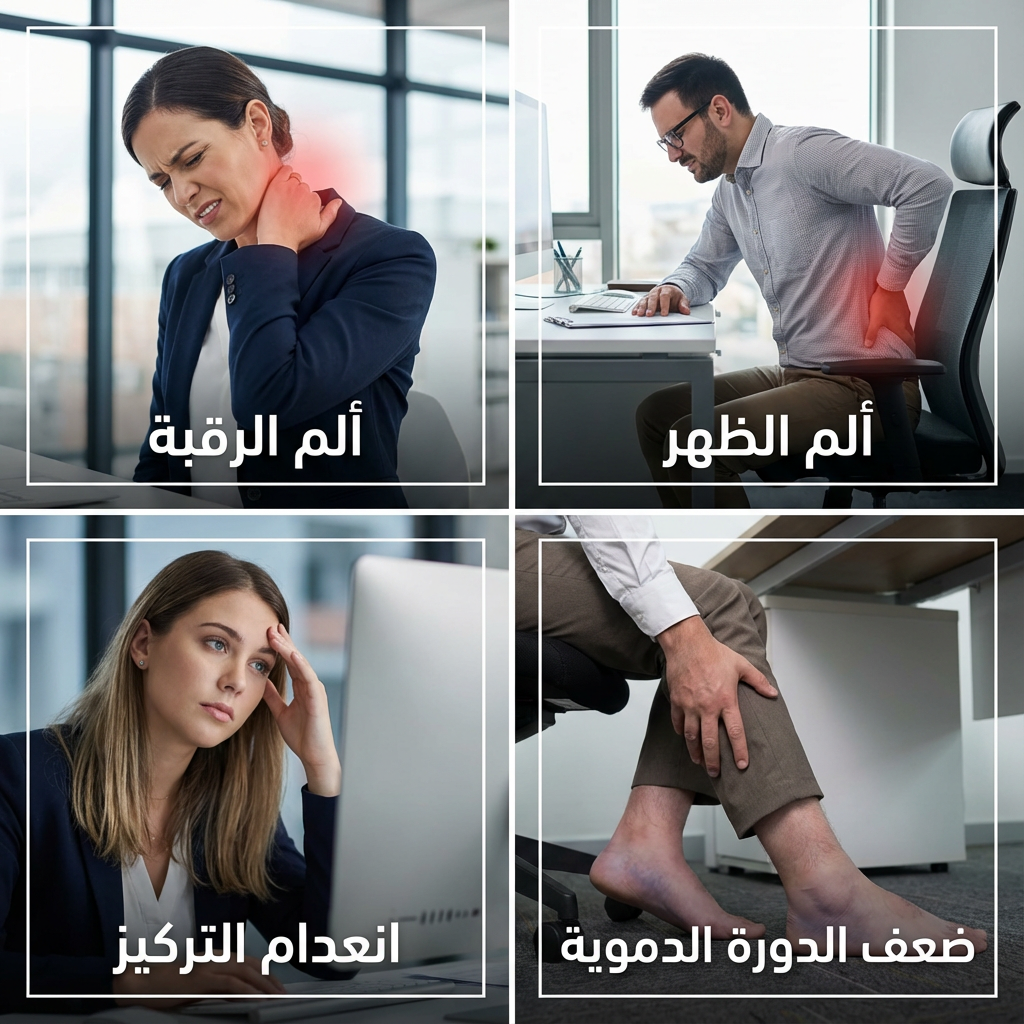 الجلوس الطويل على المكتب أو الابتوب بيعمل آلام شديدة في الرقبة والاكتاف والظهر، وده بيقلّل تركيزك ويزوّد إجهادك. ومع الإهمال، الوجع بيتحوّل لمشكلة مزمنة وصعب علاجها.